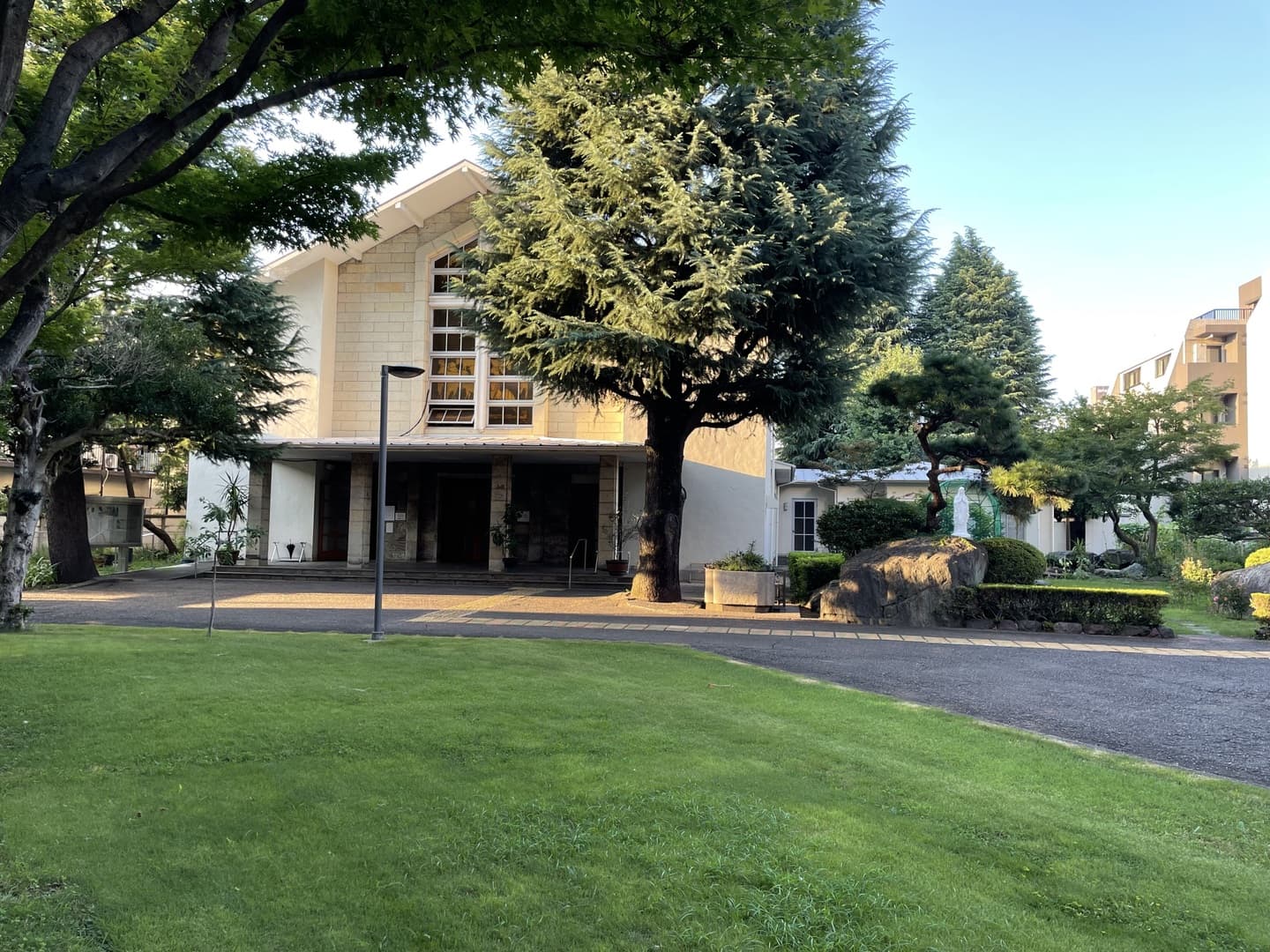 ※吉祥寺通りに面したマンションにも吉祥寺教会と看板が出ていますが、そちらはミサを行う聖堂ではなく、事務室や会議室のある信徒会館です。聖堂は吉祥寺通りから敷地を芝生の庭にそって進み、マリア像のある小庭園横の独立して立つ建物です。
