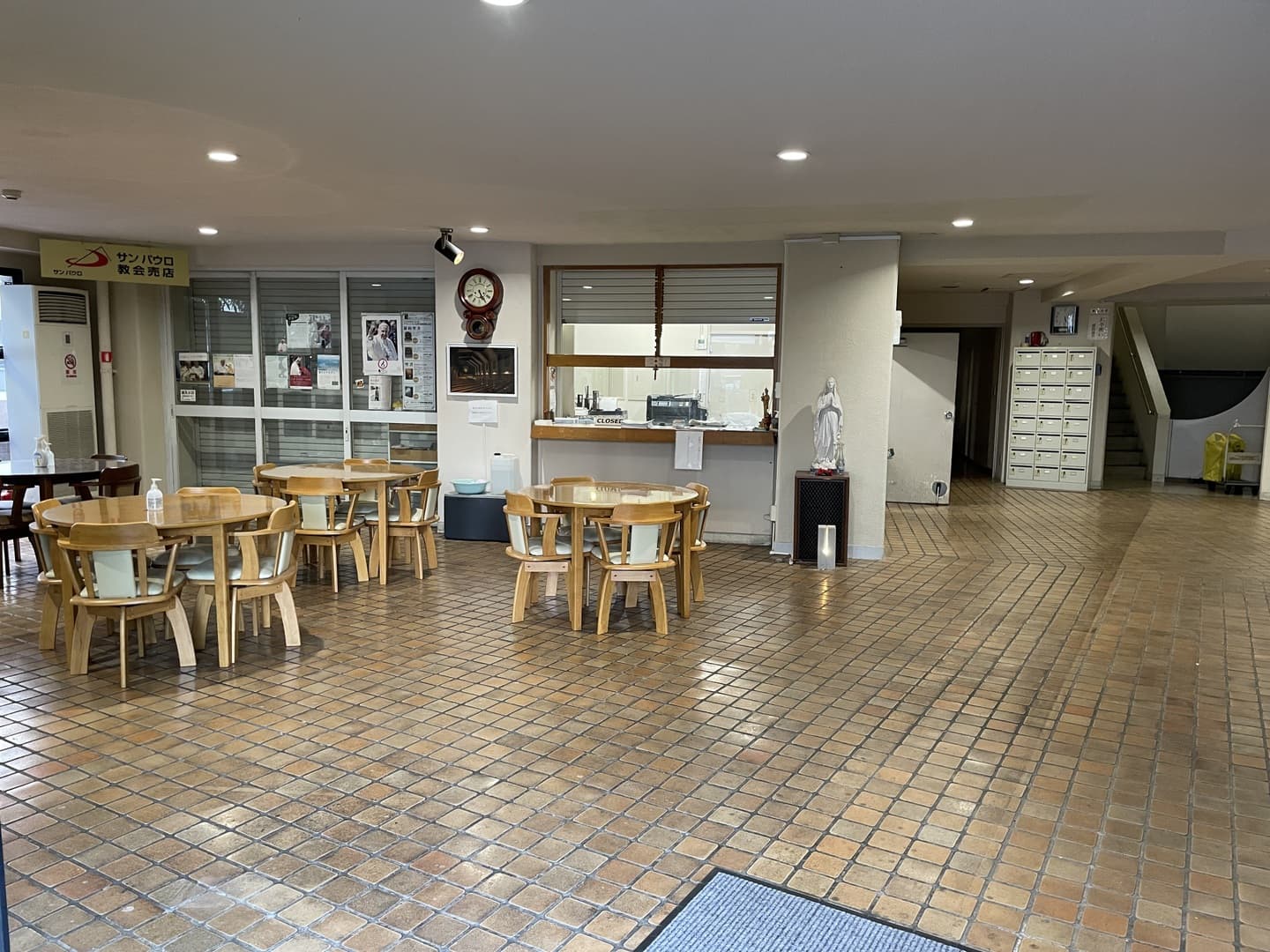 聖堂に隣接するマンションの北側角に信徒会館の入り口があります。(吉祥寺通りに面しているマンション管理室とは別の入り口です。お間違えなきようご注意ください)自動ドアから入った1階正面が受付・事務室になります。お気軽にお声がけください。