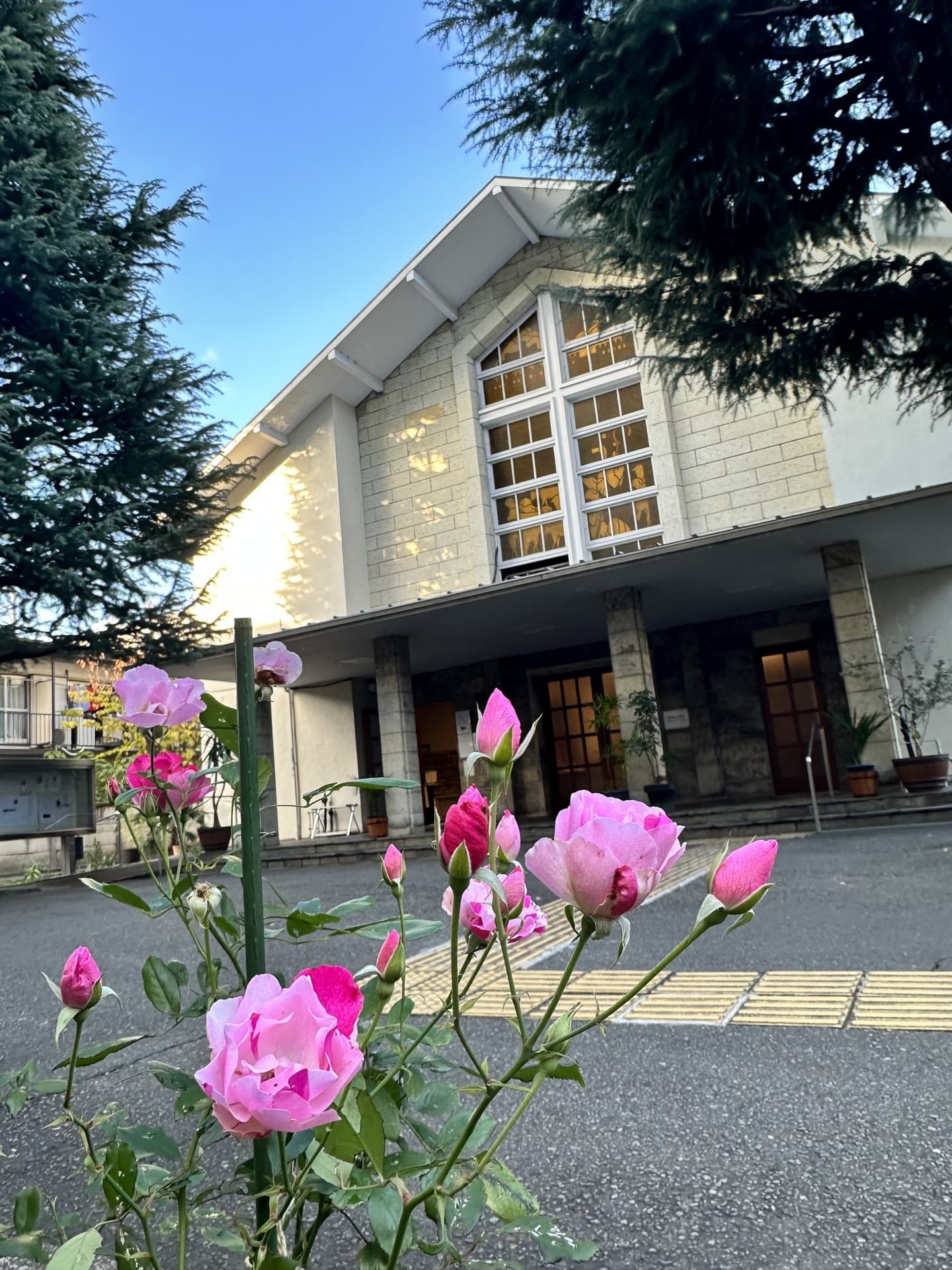 聖堂は吉祥寺通りから100メートルほ奥まったところに立つ白い建物です。午前7時~午後8時半まであいています。どなたでもご自由にお入りください。