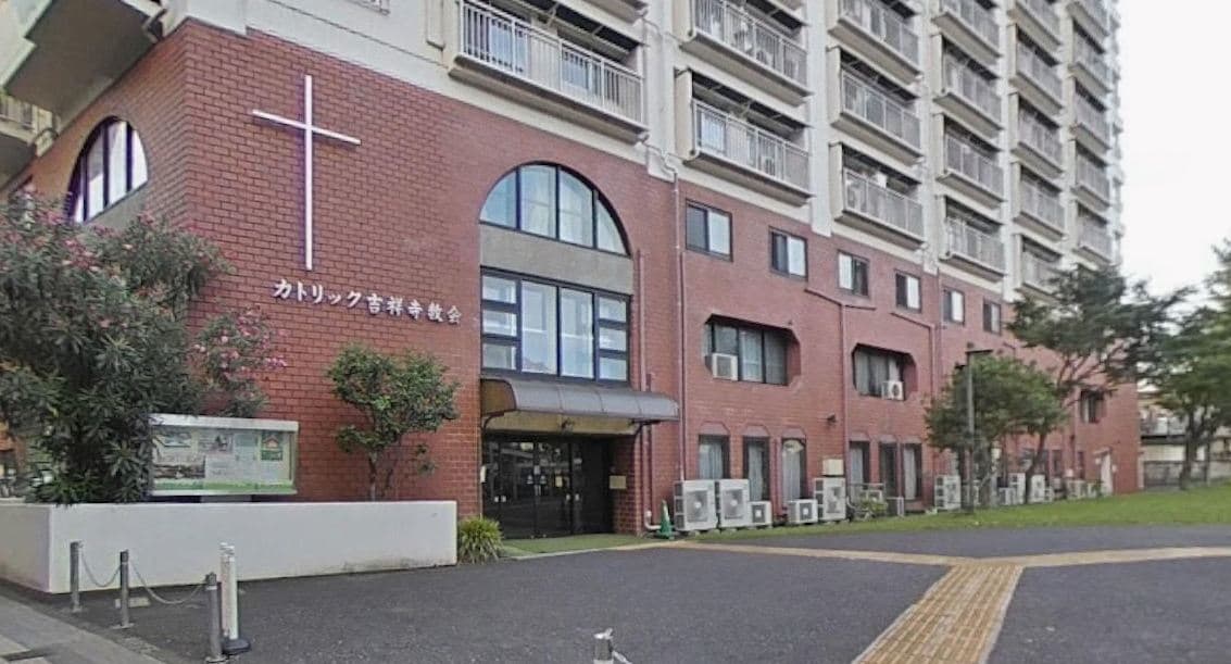 ※吉祥寺通りに面したマンションにも吉祥寺教会と看板が出ていますが、そちらはミサを行う聖堂ではなく、事務室や会議室のある信徒会館です。聖堂は吉祥寺通りから敷地を芝生の庭にそって進み、マリア像のある小庭園横の独立して立つ建物です。